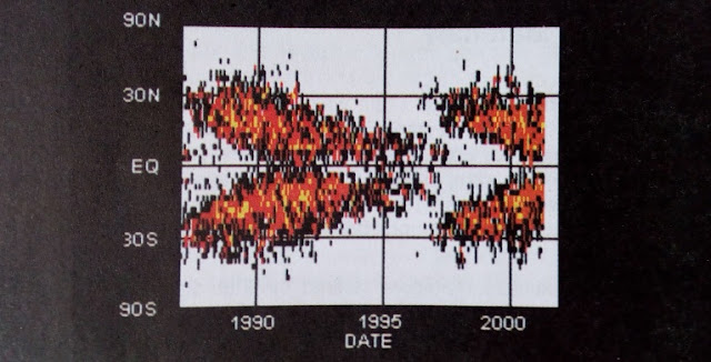 Siklus matahari dapat diketahui dari perubahan jumlah bintik matahari dari waktu ke waktu. Selain itu digambarkan pula dalam diagram kupu-kupu ( gambar 1 dan 2  Siklus Matahari ). Diagram yang eksotis ini melukiskan variasi posisi bintik matahari dalam lintang utara dan selatan matahari terhadap waktu. Awal siklus ditandai dengan munculnya bintik matahari pada lintang 40° - 50°.                Tidak pernah ditemukan bintik matahari pada lintang tinggi. Seiring dengan perjalanan waktu, kelompok bintik matahari berikutnya muncul pada lintang yang lebih rendah. Pola kenampakan ini berlanjut sampai satu periode siklus 11 tahun. Saat itu bintik matahari tampak di dekat ekuator, sekitar 5°. Jarang bintik matahari yang bergerak melewati ekuator matahari. Variasi posisi bintik matahari dalam lintang sebagai fungsi waktu terlihat dalam  Gamb...